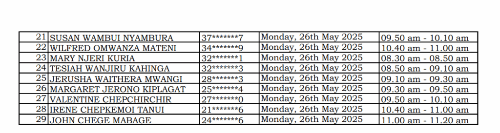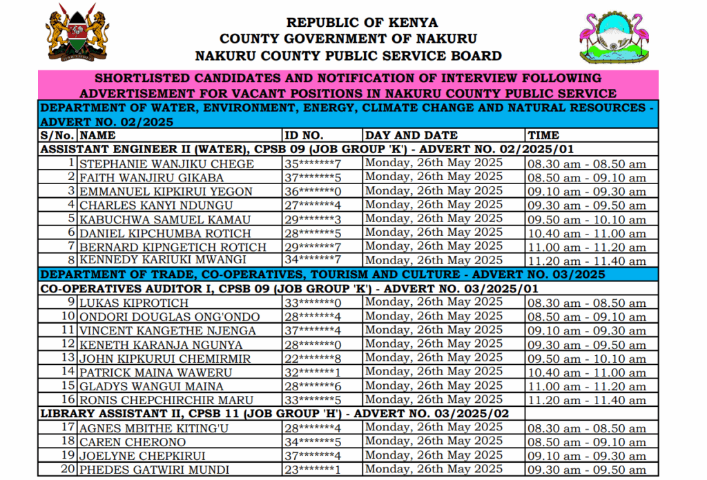 Shortlisted candidates across all departments are to report for screening and interview test on Monday, 25th May 2025 at the Nakuru County Public Service Board office – Public Works building along Prisons road etc. by 9:00am – 5:00pm.